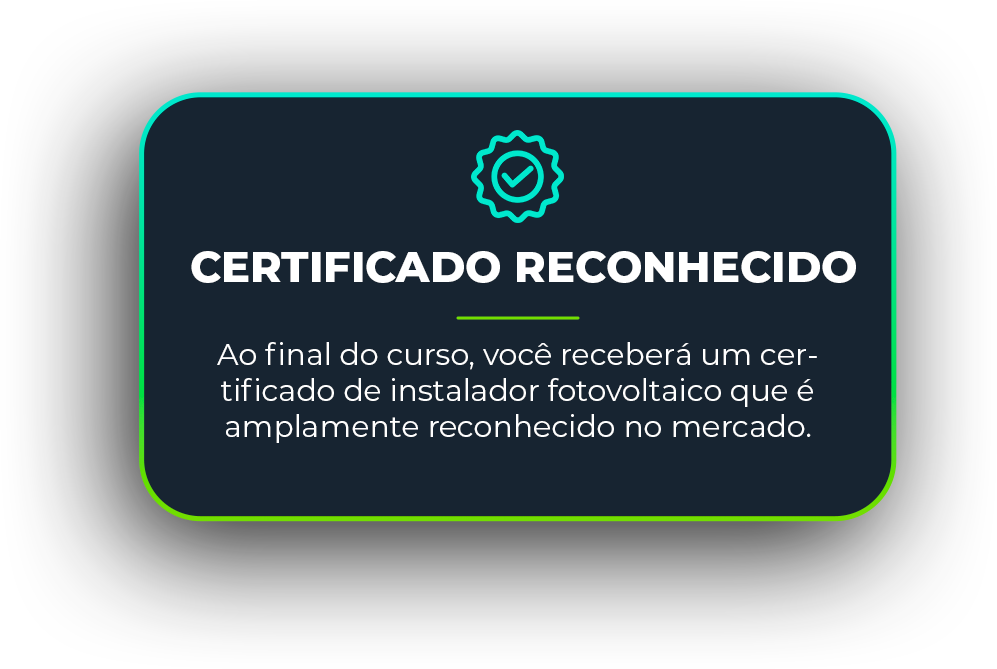 Ao final do curso, todos os participantes receberão um certificado reconhecido no mercado, que comprove suas novas habilidades como instalador fotovoltaico.