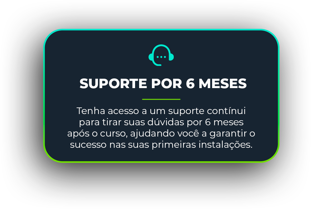 Sim! Oferecemos suporte técnico para dúvidas durante 6 meses após a conclusão do curso. Isso permitirá que você tenha confiança em suas primeiras instalações e se desenvolva no mercado com segurança.